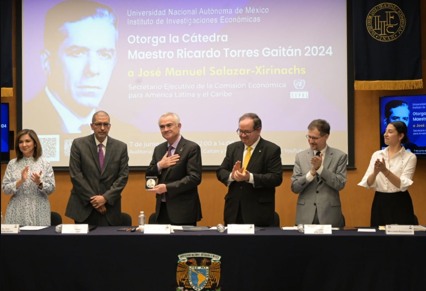 La Universidad Nacional Autónoma de México (UNAM) otorgó este 7 de junio la «Cátedra Maestro Ricardo Torres Gaitán 2024» a José Manuel Salazar-Xirinachs, secretario ejecutivo de la Comisión Económica para América Latina y el Caribe (CEPAL).