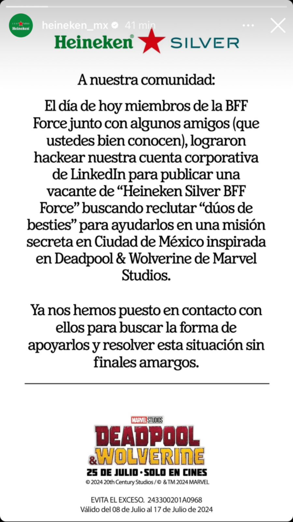 De forma audaz e inesperada, una misteriosa “BFF Force” y “algunos amigos especiales” sorprendieron a todos al hackear el perfil de la red social profesional de la reconocida compañía HEINEKEN México, ¿su objetivo?, publicar una vacante para formar parte de su escuadrón exclusivo en México y salvar al universo de un final amargo ¡awww!