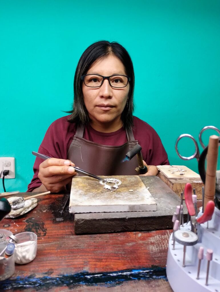 Alma Rosy Sánchez Tapia se dedica al trabajo de la plata. La maestra, oriunda de San Felipe del Progreso, Estado de México destaca por sus hermosos trabajos refinados en joyería en plata, utilizando la técnica de plata martillada y la filigrana. Algunas de sus piezas más singulares son aretes, collares, pulseras, anillos, entre otros objetos decorativos.