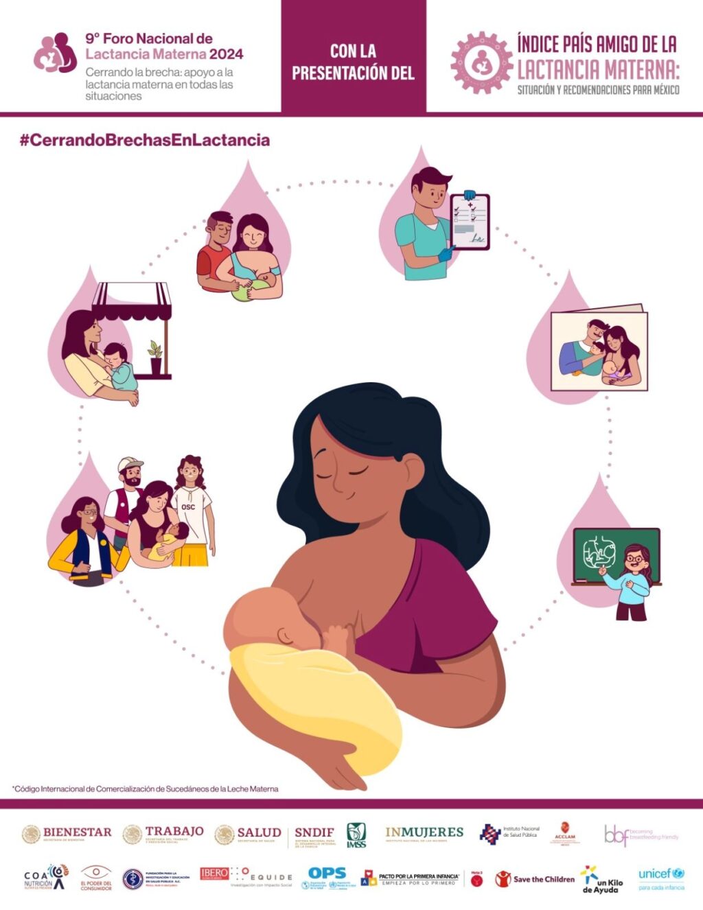 El Foro #CerrandoBrechasEnLactancia es convocado por la Secretaría del Bienestar, la Secretaría del Trabajo y Previsión Social (STPS), el Sistema Nacional para el Desarrollo Integral de la Familia (SNDIF), el Instituto Mexicano del Seguro Social (IMSS), el Instituto Nacional de las Mujeres (Inmujeres), el Instituto Nacional de Salud Pública (INSP), la Asociación de Consultores Certificados en Lactancia Materna (ACCLAM), el Centro de Orientación Alimentaria (COA Nutrición), el Poder del Consumidor, la Fundación para la Investigación y Educación en Salud Pública (FIESP), la Organización Panamericana de la Salud (OPS), la Universidad Iberoamericana, el Pacto por la Primera Infancia, Save the Children,