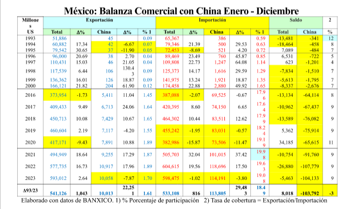 Y es que, por ejemplo, en 2023 las importaciones o compras de artículos provenientes de China hacia suelo mexicano sumaron 114 mil 191 millones de dólares; sin embargo, ese mismo año México exportó o vendió mercancías a este país asiático por tan solo 10 mil 58 millones de dólares (mdd), de acuerdo con Arnulfo R. Gómez, también candidato a la Medalla Belisario Domínguez 2024 del Senado de la República.