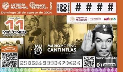 La Secretaría de Turismo (Sectur) del Gobierno de México y Lotería Nacional presentaron el billete del Sorteo Zodiaco Especial No. 1672, en el marco de la inauguración del Museo Mario Moreno “Cantinflas”, el cual cuenta con más de 777 objetos originales del ídolo mexicano, además de audiovisuales y salas interactivas que mantendrán viva la figura y legado, tanto cinematográfico como cultural, del “mimo de México”.