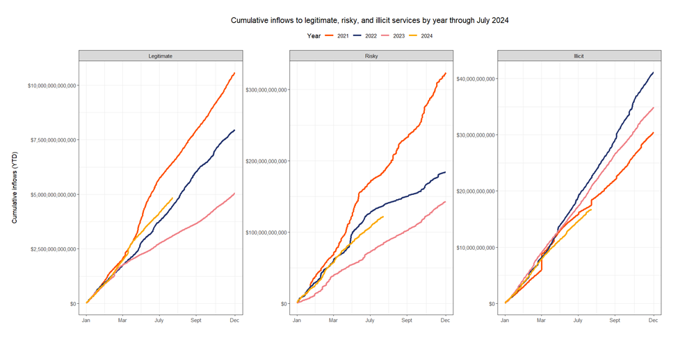 2024 has seen a number of positive developments for the cryptocurrency ecosystem. In many ways, crypto has continued to gain mainstream acceptance, following the approval of spot Bitcoin and Ethereum exchange-traded funds (ETFs) in the United States and revisions to the Financial Accounting Standards Board (FASB)’s fair accounting rules. But as with any new technology, adoption will grow among both good and bad actors. And while illicit activity is down year-to-date (YTD) compared to previous years, crypto inflows to specific cybercrime-related entities show some worrying trends.
