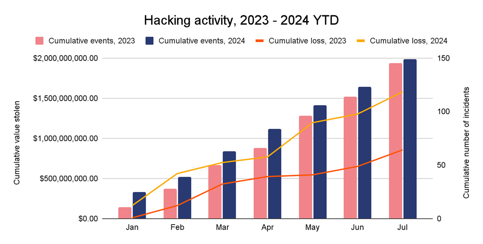 After a 50% drawdown in crypto value stolen in 2023 compared to 2022, this year has seen a resurgence of hacking activity. Comparing both amounts stolen and the number of hacking incidents YoY is telling. As the chart below demonstrates, cumulative value stolen this year through the end of July has already crested $1.58B and is around 84.4% greater than the value stolen over the same period last year. Interestingly, the number of hacking incidents in 2024 has only marginally outpaced that of 2023, rising at just 2.76% YoY. The average amount of value compromised per event has increased by 79.46%, rising from $5.9M per event from January to July of 2023 to $10.6M per event thus far in 2024, based on the value of the assets at the time of theft.