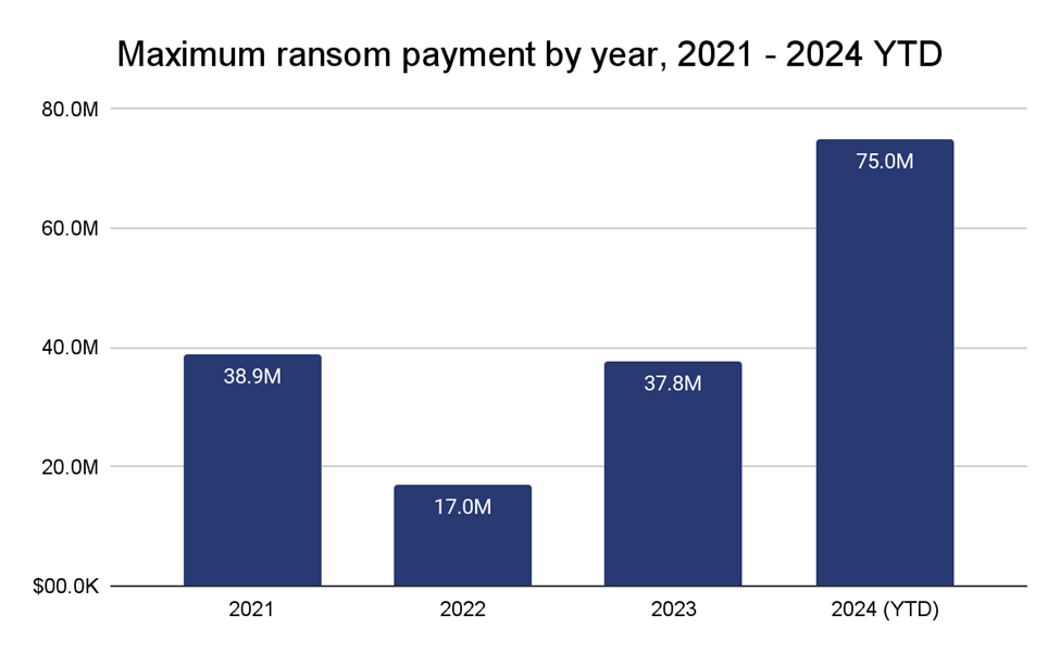 As shown in the chart below, ransomware attacks are also getting demonstrably worse. One remarkable change is the ballooning of the maximum ransom payment that we have observed in a given year. Thus far, 2024 saw the largest single payment ever recorded at approximately $75M to a ransomware group known as Dark Angels. This jump in maximum payment size also represents a 96% YoY growth in the maximum payment from 2023 and a 335% increase from the maximum payment made in 2022.