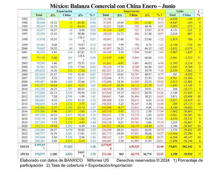 China continúa golpeando a México en sentido comercial, pues de acuerdo con el experto en comercio internacional, Arnulfo R. Gómez, durante el primer semestre de 2024 la nación azteca tuvo un déficit de 56 mil 148 millones de dólares (mdd) en el intercambio mercantil con el gigante asiático.