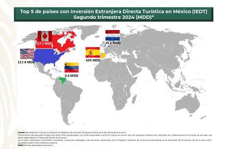 Torruco Marqués informó que durante el periodo abril-junio de 2024, los países que registraron el mayor flujo de IEDT fueron: España con 634 millones de dólares, lo que representa el 77.3% del total; Estados Unidos con 117.4 millones de dólares, que equivale al 14.3% del total; Países Bajos con 29.2 millones de dólares, esto es el 3.6% del total; y Canadá con 27.1 millones de dólares, lo que significa el 3.3%.