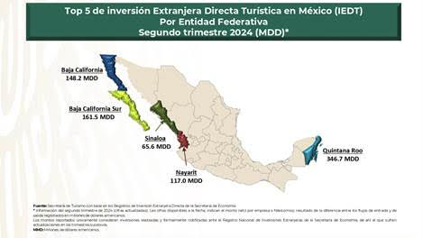 El secretario de Turismo del Gobierno de México, Miguel Torruco Marqués, informó que, con base en los Registros de Inversión Extranjera Directa de la Secretaría de Economía; del 2019 al segundo trimestre de 2024, la Inversión Extranjera Directa Turística (IEDT) registró 13 mil 207.3 millones de dólares, esto es, un 122% más a lo captado de 2013 al segundo trimestre de 2018.