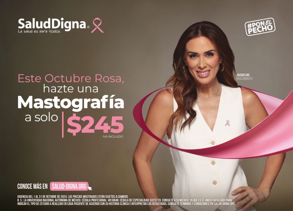 Para continuar con este objetivo, la organización anunció que la campaña #PonElPecho 2024 tiene como embajadora oficial a la artista mexicana Jacqueline Bracamontes, quien se encargará de potenciar su mensaje. Asimismo, Salud Digna informó que ofrecerá un total de 10 mil mastografías sin costo para todas las mujeres mexicanas en edad de riesgo a partir del viernes 18 de octubre, preludio al día 19, fecha en la que se conmemora del Día Internacional de la Lucha contra el Cáncer de Mama; las cuales podrán hacerse válidas durante el resto del mes rosa, en la clínica y horario de la preferencia de cada paciente.