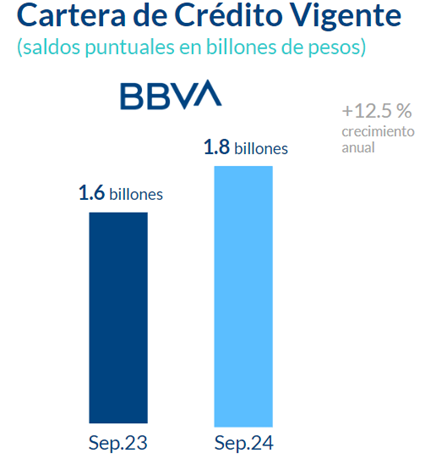 BBVA México dio a conocer su Informe de Resultados del tercer trimestre de 2024, en el que destaca que la cartera total creció más de 200 mil millones de pesos con respecto al año previo, cerrando en 1.8 billones de pesos, equivalente a un crecimiento anual de 12.5%. Este incremento está sustentado en el dinamismo de todas las carteras, tanto las vinculadas a las familias, así como a los segmentos empresariales y corporativos.