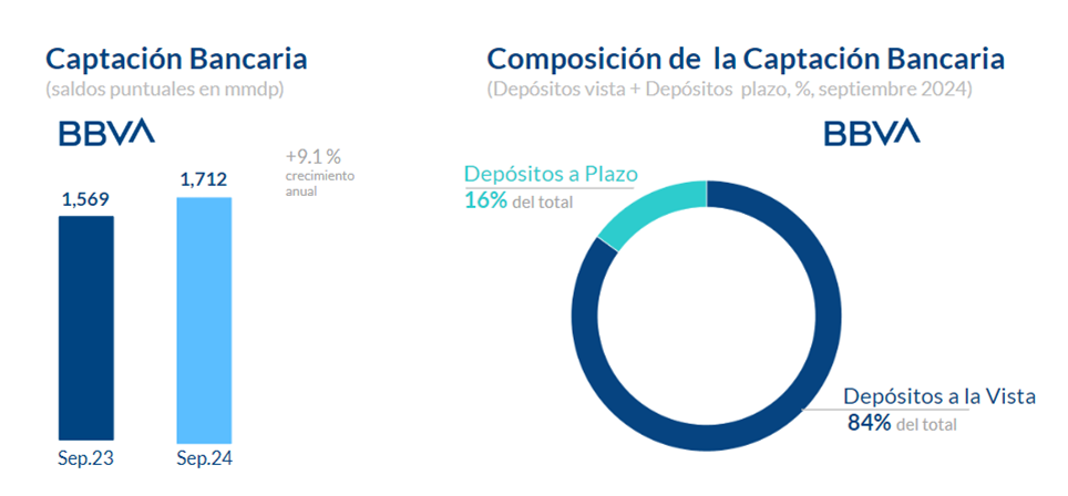 La captación bancaria vista y ahorro registra un saldo de 1.4 billones de pesos con un incremento de 10.1%. En lo que corresponde a plazo, reporta 276,000 mdp con un crecimiento de 4.4%. En las sociedades de inversión suma 972,000 mdp, 24.1% más que el año anterior. El total de recursos de clientes del banco asciende a 2.7 billones de pesos, 14.1% más que en 2023.