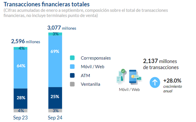 Las transacciones financieras realizadas durante los primeros nueve meses del 2024 sumaron más de 3,077 millones, 18.5% más que el mismo período de 2023. El número de transacciones dentro de los canales digitales (móvil y web) representan 69.0% del total.