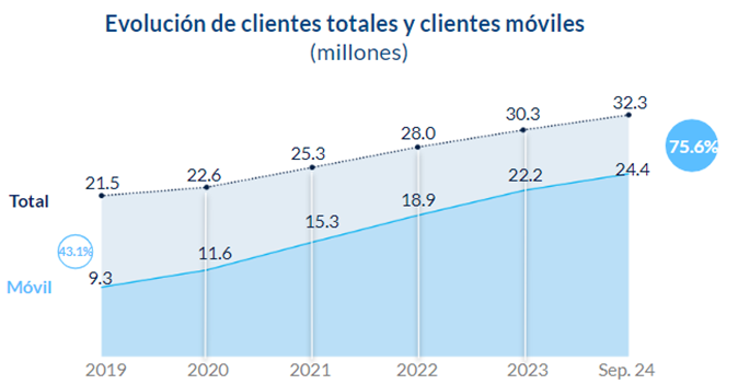 La institución financiera alcanza al mes de septiembre un total de 32.3 millones de clientes y llega al récord de 24.4 millones de usuarios que ya transaccionan a través del celular.