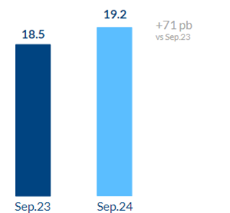 A septiembre de 2024, el índice de capital total se ubicó en 19.2%, cubriendo holgadamente con el requerimiento mínimo regulatorio.