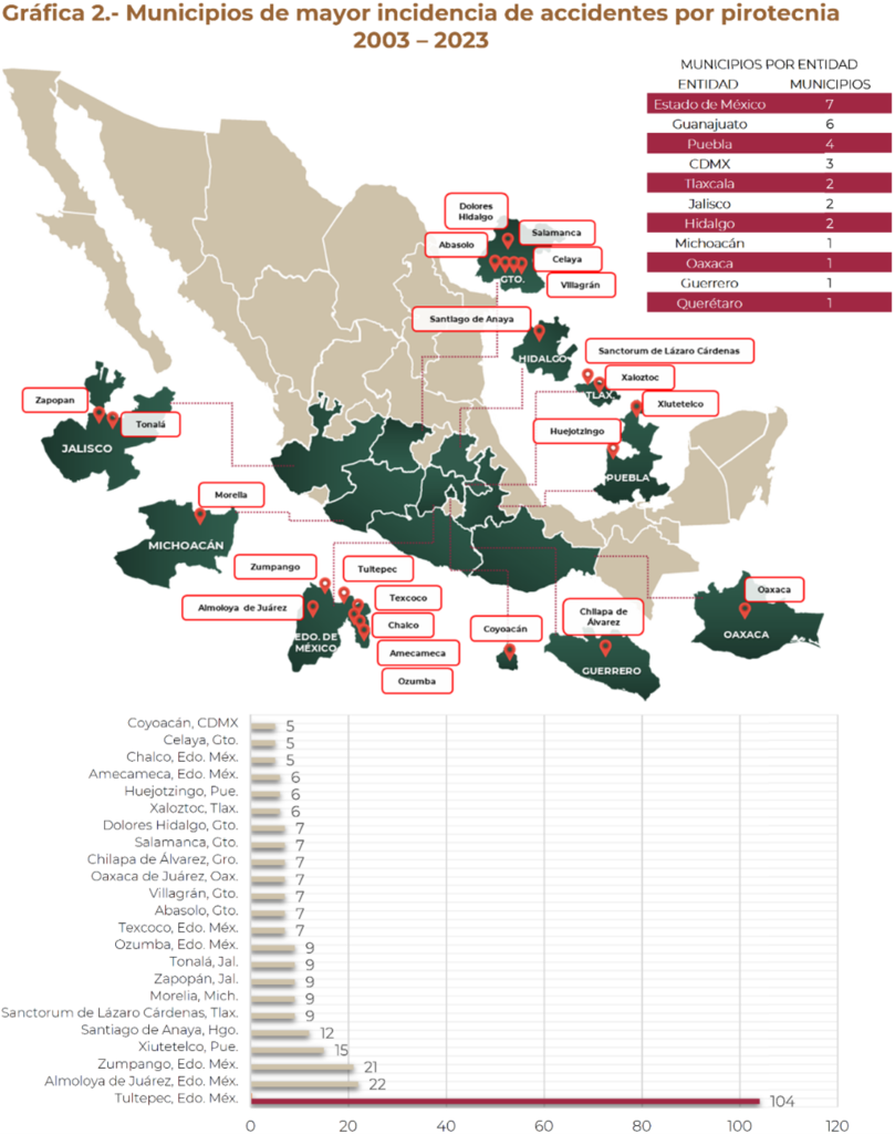 Según el Centro Nacional de Prevención de Desastres (CENAPRED), hay 23 municipios que concentran el mayor número de accidentes por pirotecnia, Tultepec se ubica en la primera posición con 34.6% de incidencias.