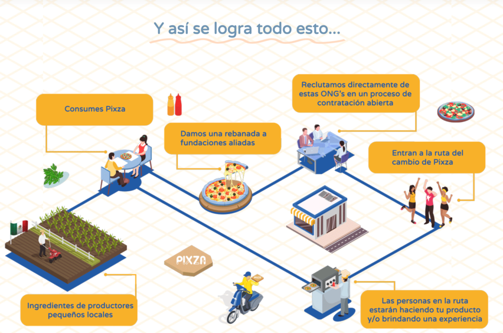 Pixza es la única empresa mexicana pionera en crear una pizza hecha de maíz azul con una mezcla del 100% de ingredientes mexicanos. Pixza nace con la visión de crear una plataforma para promover la inclusión sostenible, a través de la Ruta de Cambio. Con este modelo de empoderamiento multidimensional impulsa a jóvenes de 17 a 35 años con un perfil de abandono social que forman parte de fundaciones y organizaciones. Gracias a este modelo Pixzasolo emplea a jóvenes para que formen parte de un programa de 12 meses y así alcanzar 3 ejes de acción: Asegurar, mantener y crecer el empleo formal, desarrollar habilidades profesionales y para su vida, y crear e impulsar un plan de vida personal-profesional.