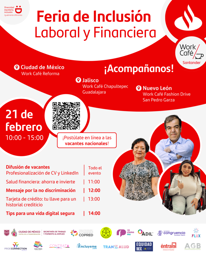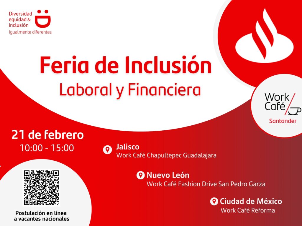 Banco Santander México llevará a cabo la primera Feria de Inclusión Laboral y Financiera el próximo viernes 21 de febrero, de manera simultánea en tres Work Café del Banco: Ciudad de México, Guadalajara y Monterrey; con el objetivo de atraer y promover el talento perteneciente a distintos grupos prioritarios, como son personas que viven con discapacidad, personas mayores y de la comunidad LGBTQ+, entre otras.