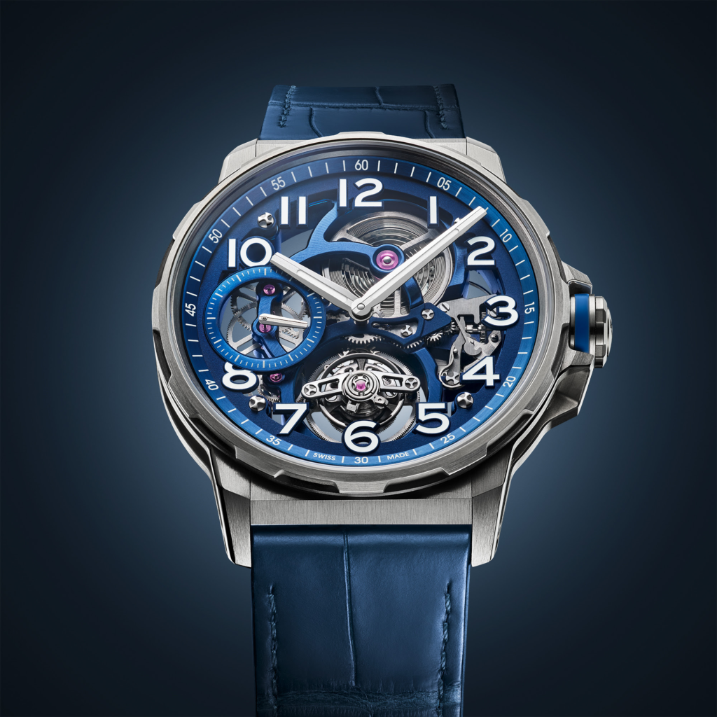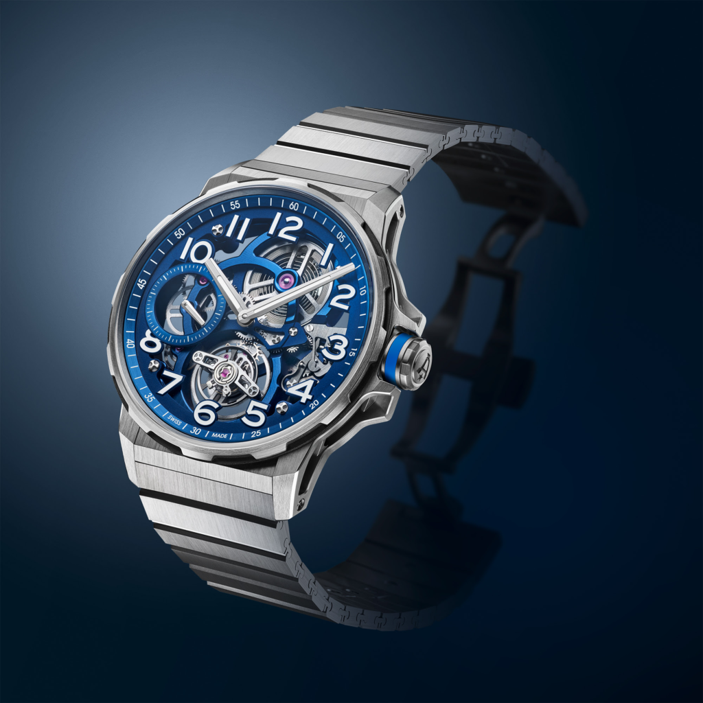 El centro dela caja, con un diseño calado, se extiende hasta la corona, que muestra el logotipo de Angelus. El cristal de zafiro está rodeado por un bisel de doce muescas, mientras que las asas facetadas sostienen el sistema de pulseras intercambiables. Ya sea en la versión de titanio de un solo eslabón o en piel de caimán azul mate, el Flying Tourbillon Titanium se presenta con una pulsera de caucho azul complementaria.