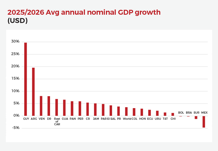 Una razón menos obvia para el crecimiento en dólares del Caribe inglés es la sólida gobernanza de muchas de las economías de la región, encabezadas por Jamaica y las Bahamas. Jamaica ha hecho un trabajo notable para reducir los niveles de deuda gubernamental, que ahora rondan el 60% del PIB, el nivel más bajo en 30 años. El Caribe inglés no está muy expuesto al riesgo comercial de los EE. UU., dado que muy poco de su economía depende de la exportación de productos a cualquier mercado. Parece probable que en el futuro previsible haya un dólar estadounidense fuerte, lo que ayudará a garantizar un flujo constante de turistas y clientes bancarios en el extranjero. Lo que puede afectar a la región es la caída prevista del apoyo financiero de Washington DC al desarrollo económico y la ayuda posterior al huracán, que es un salvavidas vital para la región en tiempos de crisis.
