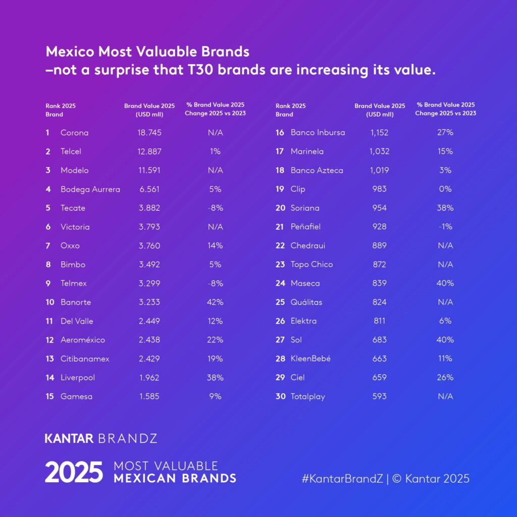 La lista de las 30 marcas mexicanas más valiosas del 2025 de Kantar BrandZ, el informe y el análisis exhaustivo ya están disponibles en: www.kantar.com/campaigns/brandz/mexico