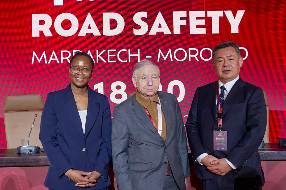 Nneka Henry, directora del Fondo de Seguridad Vial de las Naciones Unidas (izquierda), Jean Todt, enviado especial del Secretario General de las Naciones Unidas para la seguridad vial (centro), Hideaki Takaishi, director general de la División de Planificación de Seguridad de Honda (derecha)
