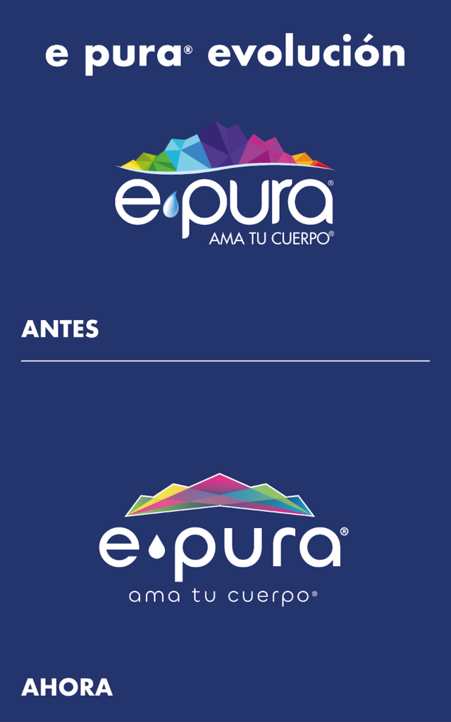 Desde sus inicios la marca se ha distinguido por tener un diseño vanguardista e innovador. En 2012, se introdujeron por primera vez los elementos propios que hoy forman parte de su identidad visual, por ejemplo, su icónico prisma, y aunque estos fueron evolucionando a lo largo del tiempo, se sentaron las bases para lo que conocemos hoy. Ahora, con esta nueva imagen, E pura® evoluciona de forma orgánica su imagen con ligeros ajustes a su emblemático logo de prismas multicolor y su tipografía. Sin embargo, el ADN, esencia y propósito de marca se mantienen para seguir ganando y conectando con los consumidores en el mercado mexicano de manera exitosa y relevante como hasta ahora lo ha hecho.