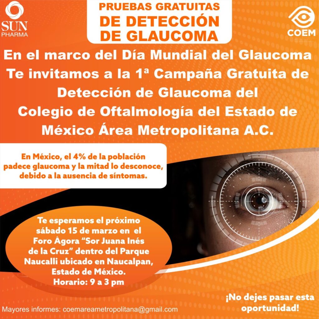 Este 2025, el Colegio de Oftalmólogos del Estado de México Área Metropolitana A.C. y Sun Pharma, han organizado la 1ª campaña gratuita de detección del Glaucoma que se realizará el sábado 15 de marzo de 9 de la mañana a 3 de la tarde en el Foro Ágora Sor Juana Inés de la Cruz del Parque Naucalli, ubicado en Perif. Blvd. Manuel Ávila Camacho Manzana 020, Boulevares, 53150 Naucalpan de Juárez, Estado de México.