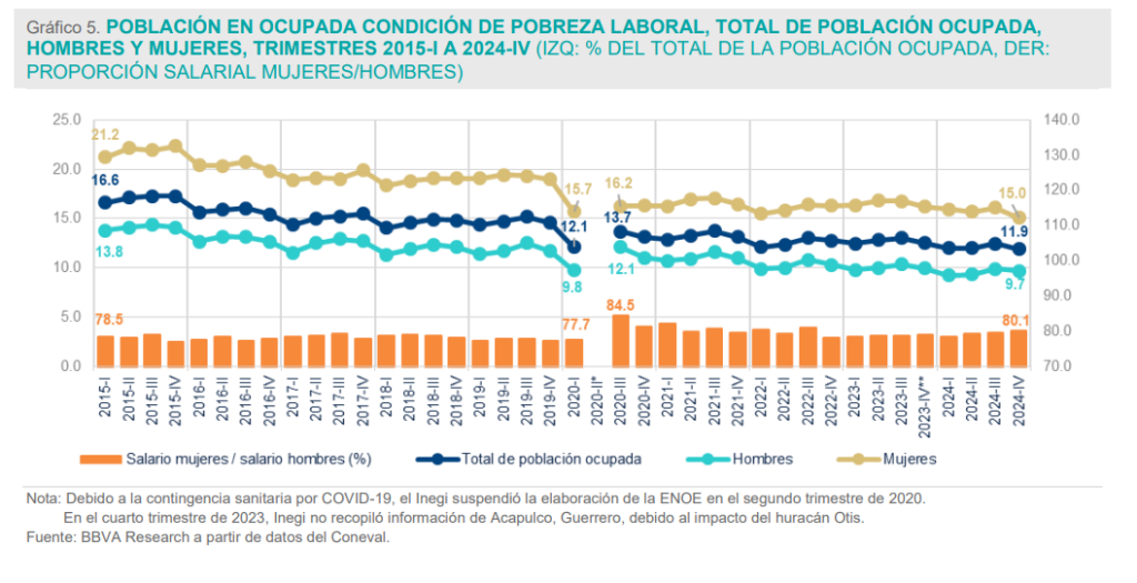 Pobreza laboral entre la población ocupada se ubica en 2024-IV en su nivel mínimo desde el 2015-I. Sin embargo, las mujeres ocupadas aún ganan en promedio el 80.1% del salario de los hombres