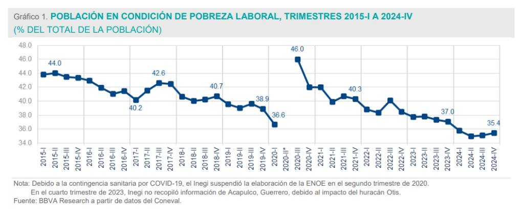 En el cuarto trimestre de 2024, el Consejo Nacional de Evaluación de la Política de Desarrollo Social (Coneval) estimó que el 35.4% de la población en México se encontraba en situación de pobreza laboral, lo que representa un aumento de 0.3 puntos porcentuales respecto al trimestre previo. La pobreza laboral en México alcanzó su nivel más bajo en el pasado segundo trimestre de 2024, con un nivel del 35.0%. Así, el nivel actual de pobreza laboral continúa en niveles muy bajos, pero 0.4 puntos porcentuales por encima de su menor nivel histórico.