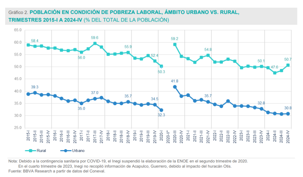 Ámbito urbano. Desde el segundo trimestre del año 2020, se ha observado una tendencia a la baja en la pobreza laboral en las zonas urbanas. En los tres trimestres comprendidos entre el segundo y cuarto trimestre de 2024, la población en pobreza laboral se ubica en sus niveles históricos más bajos, dentro de un intervalo entre 30.7% y 30.9%.