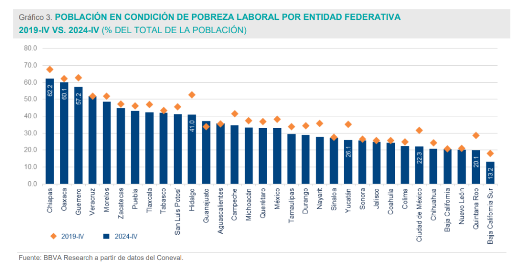 Hidalgo (-11.7 pp), Ciudad de México (-9.5 pp), Yucatán (-9.1 pp), Quintana Roo (-8.5 pp) y Nayarit (-7.9 pp) fueron las entidades donde más disminuyó la pobreza laboral entre 2019 y 2024
