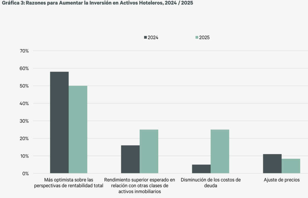 Los inversionistas se sienten optimistas sobre las perspectivas de rentabilidad total, ya que sigue siendo la razón principal para incrementar la inversión en activos hoteleros, por lo que esperan que el sector turismo continúe recuperándose en 2025.