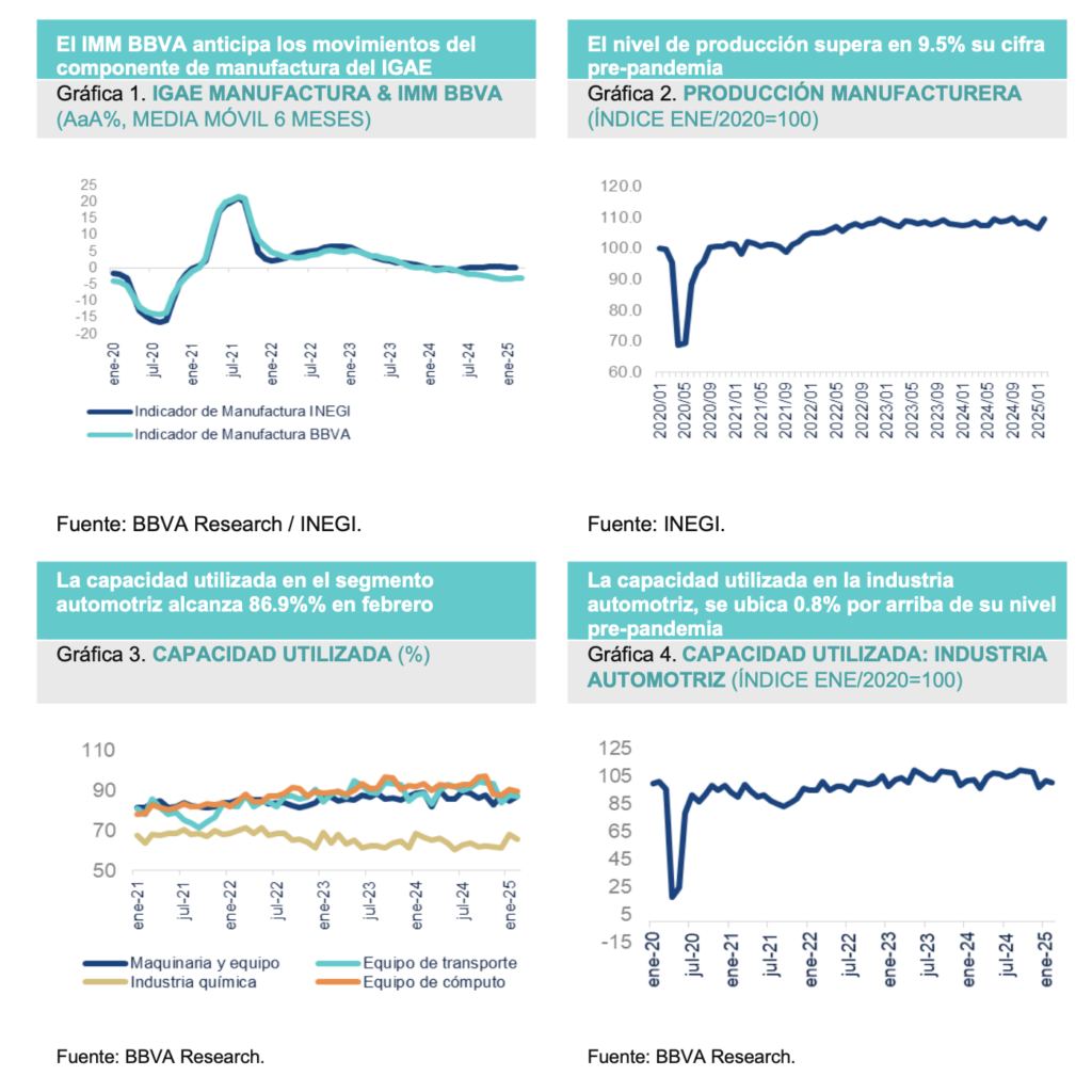 El Indicador Multidimensional de la Manufactura BBVA Research (IMM BBVA) [1] registró en marzo una variación de (-)0.4% AaA, sin cambios con respecto a la cifra observada en febrero. Considerando el dato de marzo, la tasa de crecimiento interanual promedia (-)1,6% para 1T25, lo que representa una mejora de 2,8 pp con respecto al promedio de 4T24 (-4,4%). El mejor desempeño relativo del 1T25 respecto al trimestre anterior apunta hacia un desempeño favorable del sector a principios de año, ante el adelanto de pedidos durante los meses de febrero y marzo, previo a la implementación de los nuevos aranceles en EE.UU. De acuerdo con las cifras del INEGI, el índice de pedidos manufactureros alcanzó en marzo su máximo de los últimos siete meses, mientras que el subcomponente de importaciones del ISM Manufacturero en EE.UU. superó los 50 puntos desde enero (promediando 51.3 para 1T25, 2.7 puntos por arriba del promedio registrado en 4T24).