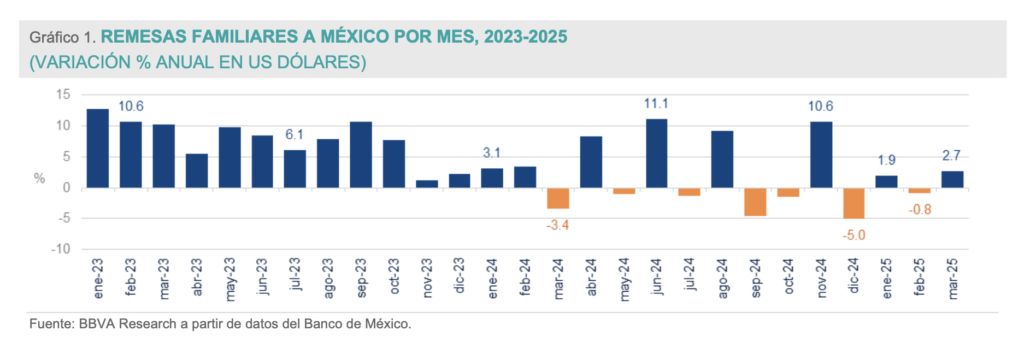 En marzo, el flujo de remesas a México creció 2.7%, llegaron a 5,150 millones de dólares. Durante el primer trimestre de 2025, México recibió 14,269 millones de dólares por remesas, lo que equivale a un crecimiento del 1.3% en comparación al mismo trimestre de 2024.