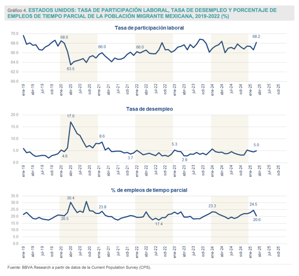 Sin afectaciones la tasa de desempleo de los migrantes mexicanos (documentados y no documentados) en EE.UU. UU., fue de 5.0% en marzo de 2025, nivel similar al reportado entre 2023 y 2024. Tampoco se han observado cambios relevantes en la tasa de participación laboral y en el porcentaje de empleos de tiempo parcial en el entorno actual con políticas antimigratorias más agresivas.