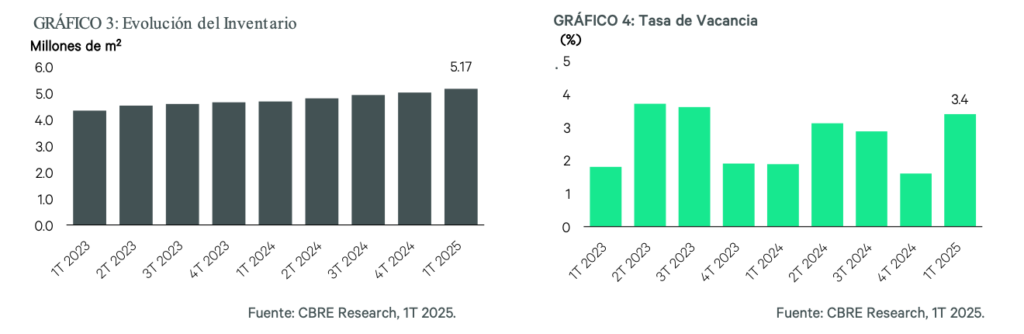 La tasa de vacancia o disponibilidad (3,4%) motivada por más de 80.000 nuevos metros vacantes, se colocó en 1,5 puntos porcentuales por arriba del 1T 2024.