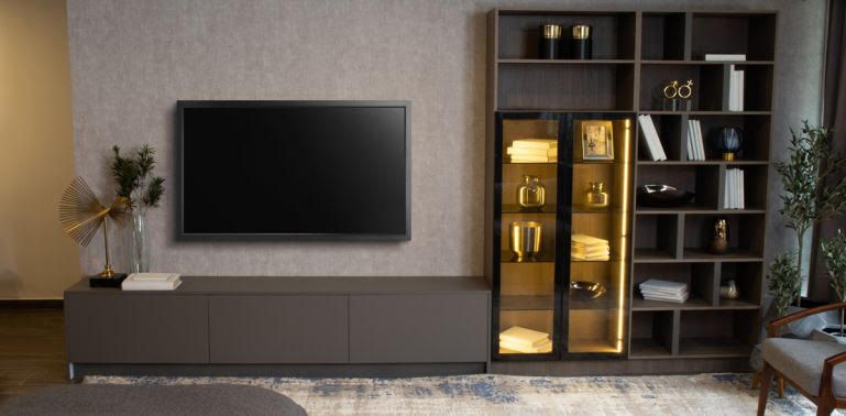 Un TV System robusto con compartimentos para consolas, películas, controles y diseño sofisticado es vital.