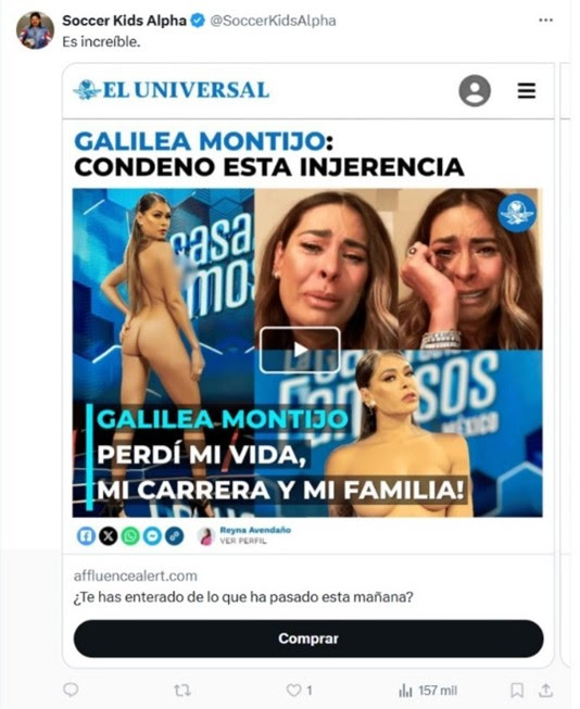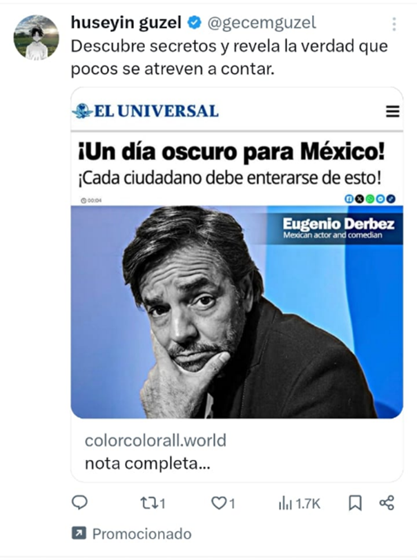 Los estafadores usan la imagen de personalidades reconocidas como Luis Miguel, Eugenio Derbez, Galilea Montijo, Thalía o Belinda; los titulares suelen anunciar muertes inesperadas, escándalos financieros o decisiones drásticas en sus carreras con frases como: