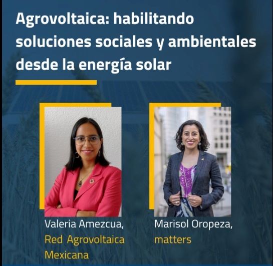 Con el propósito de fomentar el intercambio de ideas, se realizó el webinar “Agrovoltaica: habilitando soluciones sociales y ambientales desde la energía solar” con la colaboración de Marisol Oropeza, Vocera de Intersolar Mexico y Valeria Amezcua, Presidenta Red Agrovolatica Mexicana.
