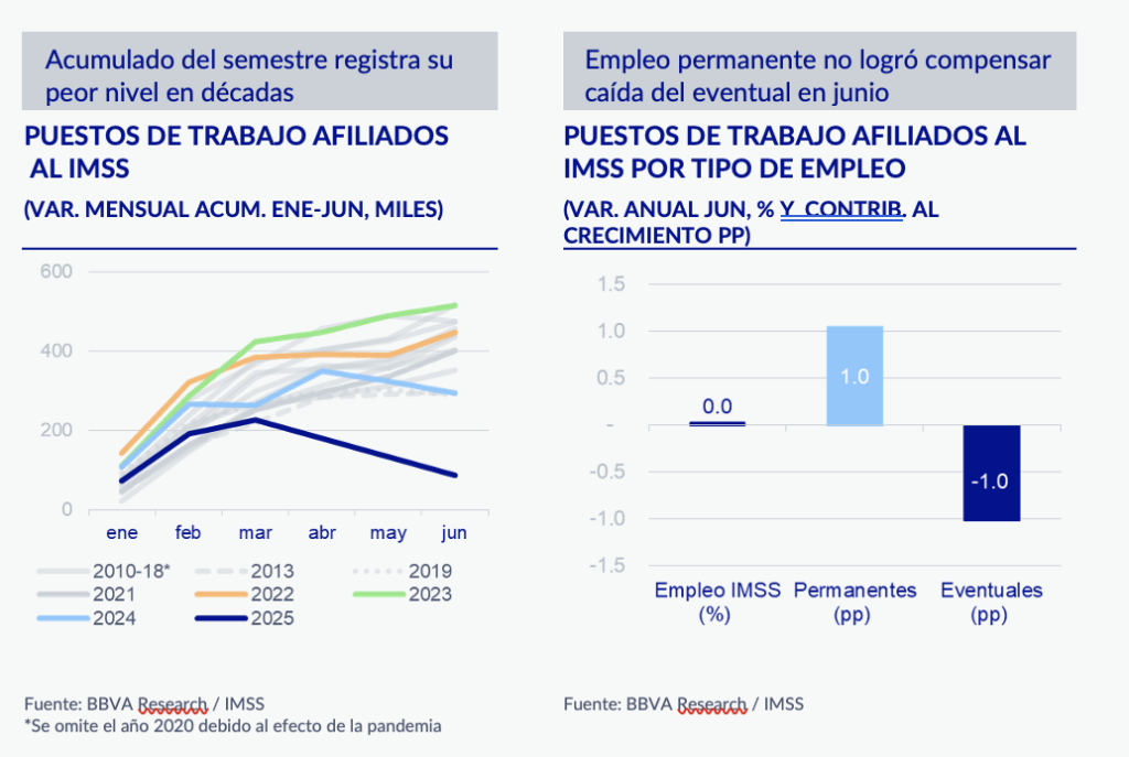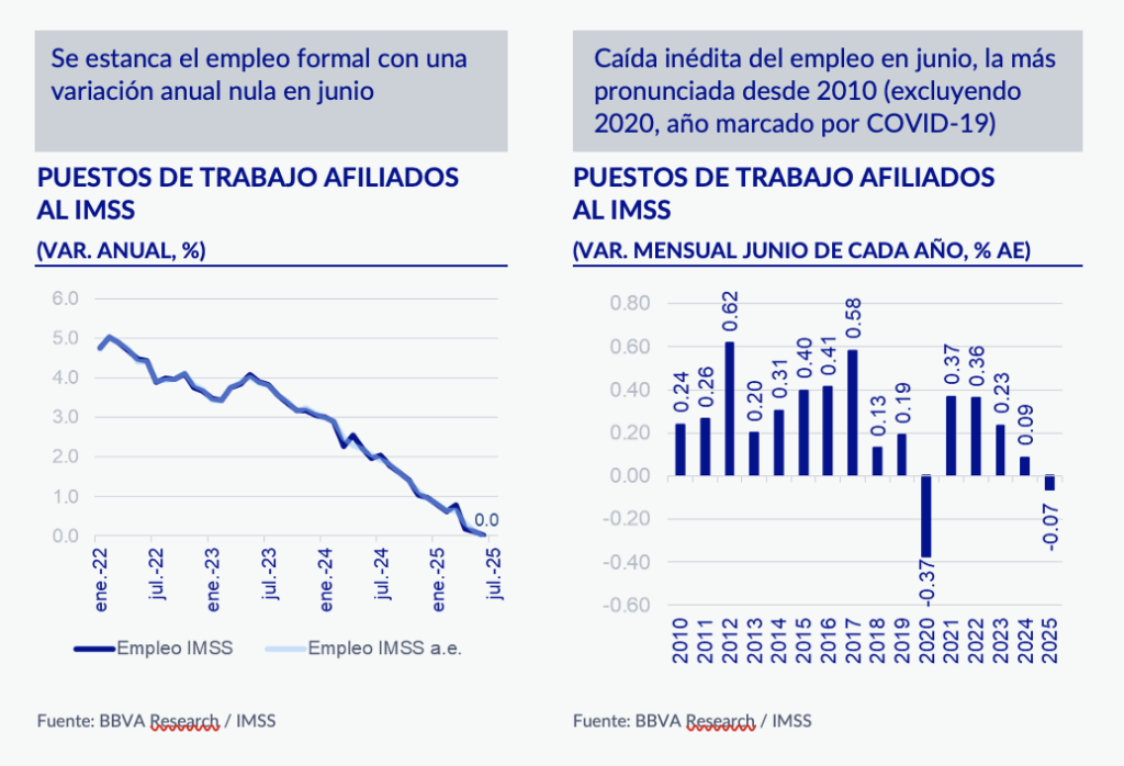 El empleo formal registró un crecimiento anual nulo en junio, prolongando su tendencia de debilidad, con una variación mensual negativa de 0.1% en cifras desestacionalizadas. De acuerdo con datos del Instituto Mexicano del Seguro Social (IMSS), durante el mes se reportó una pérdida neta de 46,378 puestos de trabajo formales, sumando así tres meses consecutivos con cifras negativas, lo que implica una reducción acumulada de 134 mil empleos en el segundo trimestre del año. Con este resultado, entre enero y junio únicamente se han creado 87 mil nuevos puestos de trabajo, cifra que representa un crecimiento acumulado de apenas 0.4%, el nivel más bajo registrado desde 2002 para un primer semestre (excluyendo 2009, año de la crisis financiera global, y 2020, año del inicio de la pandemia de COVID-19). Al considerar la dinámica desde octubre de 2024, mes que marca el inicio de la actual administración federal, el saldo en creación de empleos es negativo, con una pérdida acumulada de 155 mil plazas formales. Este desempeño refleja la pérdida de dinamismo del mercado laboral desde febrero de 2022, influenciada tanto por factores internos como externos, así como por el severo ajuste estacional registrado en diciembre de 2024, con una destrucción de 405 mil empleos, la más alta observada en la serie histórica.