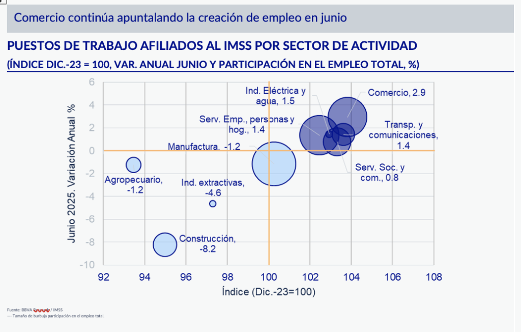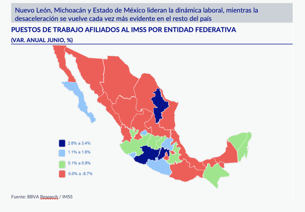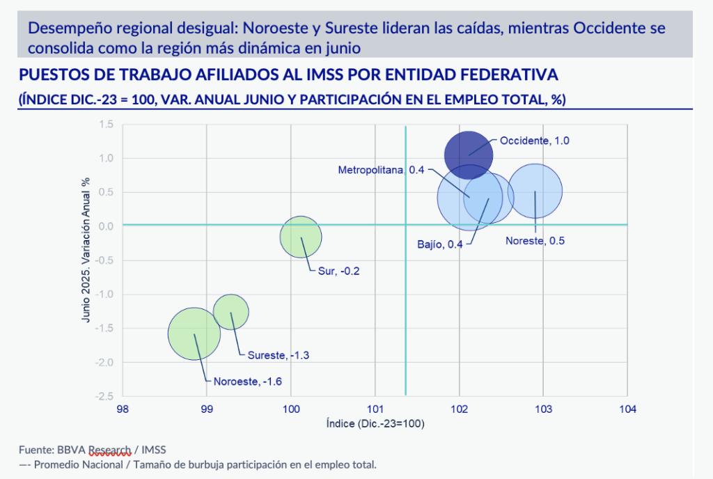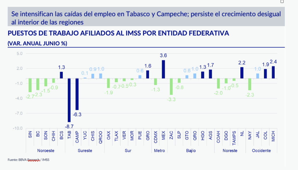 Por otro lado, las regiones Sur, Sureste y Noroeste presentaron variaciones anuales negativas en junio, siendo las más afectadas del país. Particularmente, el Sureste sigue mostrando el mayor deterioro del empleo nacional, destacando Tabasco (-8.7%) y Campeche (-6.3%) con las mayores contracciones anuales.