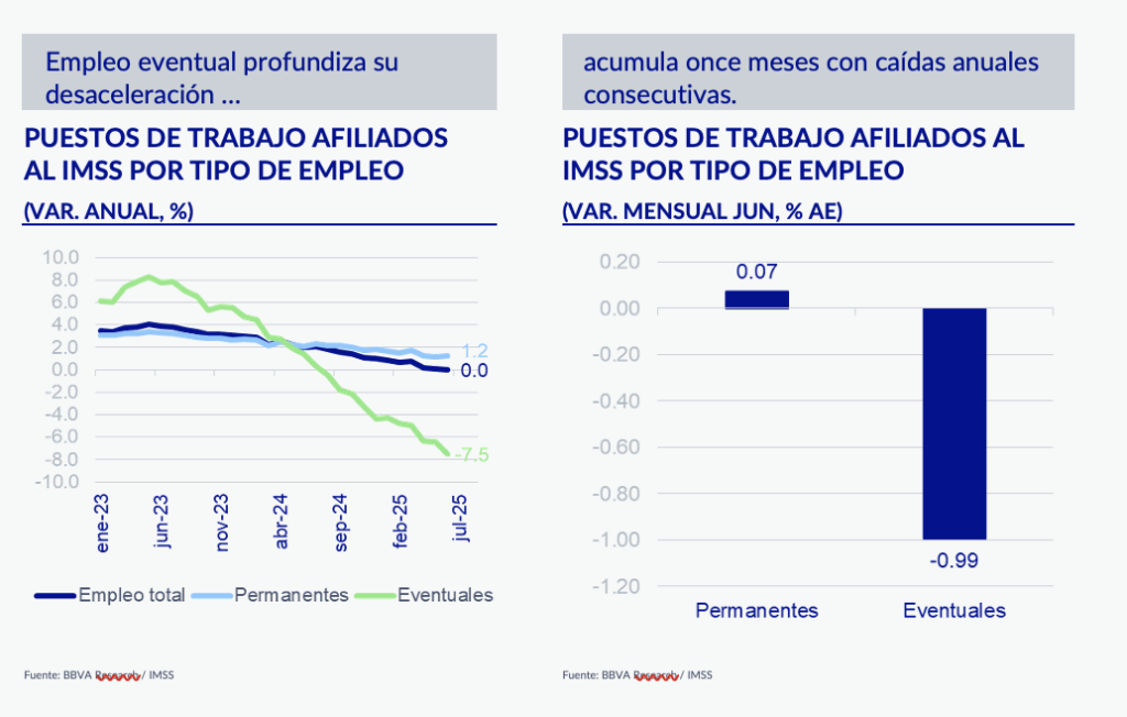 Por tipo de empleo, la debilidad de junio se explica por la pérdida de empleo de los puestos eventuales con una variación mensual negativa de 0.99% en cifras desestacionalizadas, mientras que el empleo permanente no logró compensar la caída con un crecimiento mensual de solo 0.07%.