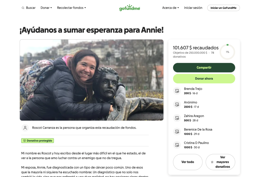 Annie es una mujer de la Ciudad de México cuyo equipo médico ha dado pocas esperanzas tras ser diagnosticada con un tipo de cáncer poco común -la familia no precisó el nombre-. “Uno de esos que la mayoría ni siquiera ha escuchado nombrar. Un diagnóstico que no solo nos cambió la vida, sino que nos enfrentó a una dura realidad, no hay opciones claras dentro del sistema de salud. Nos dijeron que ya no había más que hacer”, expone su marido, de nombre Roscot.