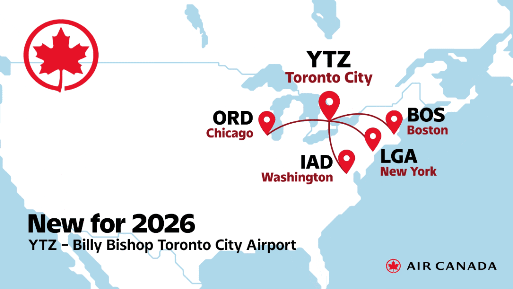 Air Canada presentó una importante expansión en el Aeropuerto Billy Bishop Toronto City (YTZ) con nuevas rutas transfronterizas a cuatro importantes ciudades de Estados Unidos y un aumento de los vuelos diarios a Montréal y Ottawa. Los nuevos servicios, con frecuencias ideales para los viajes de negocios, mejoran aún más la experiencia del pasajero en el aeropuerto Billy Bishop, incluyendo la introducción, este mes, de Wi-Fi rápido y gratuito a bordo, aperitivos premium, cerveza y vino gratuitos a bordo, y acceso exclusivo al Aspire Air Canada Café*.