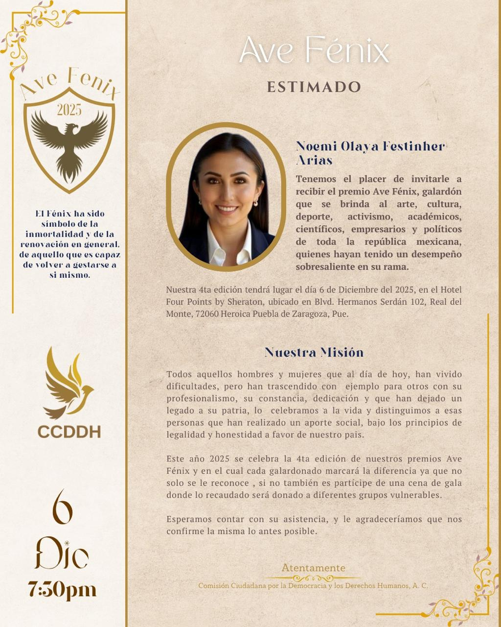 La Comisión Ciudadana por la Democracia y los Derechos Humanos, A.C. (CCDDH), organización comprometida con la defensa de los derechos humanos y la construcción de una sociedad más equitativa, anunció la realización de la cuarta edición del Premio Ave Fénix, uno de los galardones más representativos que otorga a personalidades destacadas en el arte, la cultura, el deporte, el activismo, la academia, la ciencia, el emprendimiento y la política en México. La institución, reconocida por programas que impactan de manera directa a mujeres, jóvenes y comunidades en situación de vulnerabilidad, reafirma así su misión de impulsar acciones que fortalezcan el tejido social.