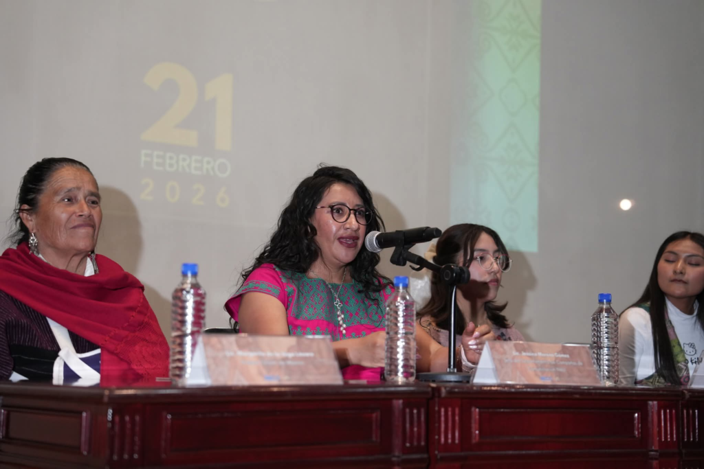 Participaron: Jessica Moreno Gómez, mujer mazahua, comunicóloga intercultural y promotora del fortalecimiento lingüístico; Gloria Isabel Jara Gutiérrez, coordinadora del Instituto Nacional de Lenguas Indígenas, impulsora de la presencia de las lenguas originarias en los medios de comunicación y Margarita de la Vega Lázaro, educadora e investigadora otomí, promotora cultural y defensora histórica de los derechos lingüísticos en el Estado de México
