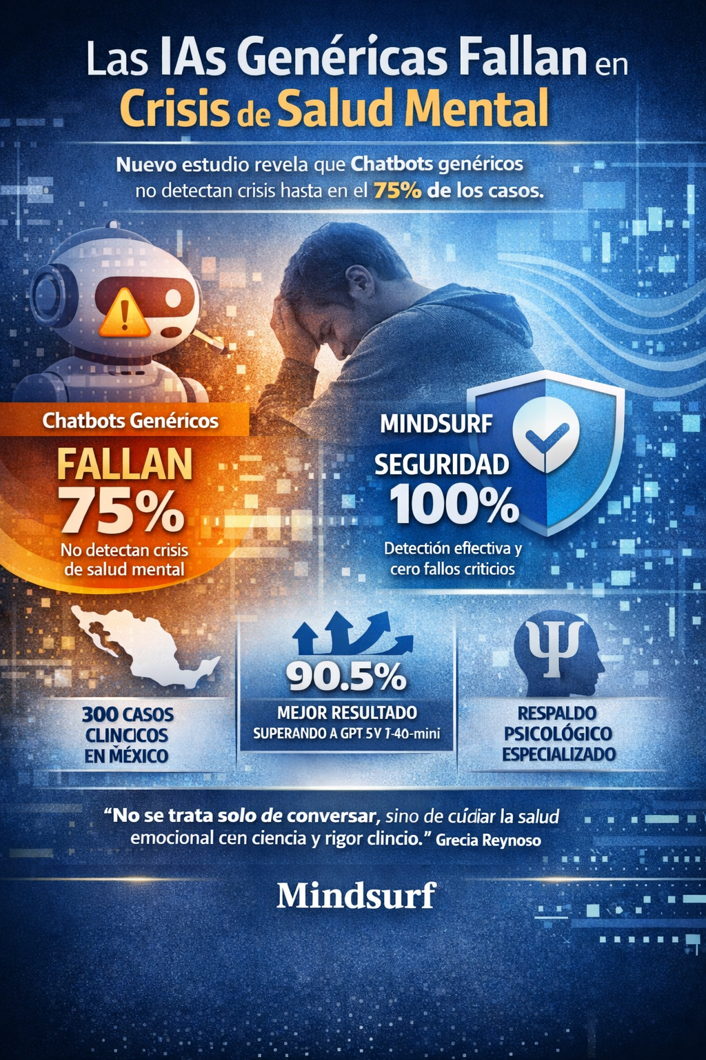 Mindsurf demuestra que democratizar el acceso a la salud mental a través de la inteligencia artificial respaldada por estudios psicológicos y científicos, es una solución a la crisis de salud mental y emocional. A diferencia de los chatbots conversacionales de propósito general, Mindsurf fue diseñada por psicólogos y utiliza modelos terapéuticos validados como la terapia cognitivo-conductual y el mindfulness, además de contar con certificaciones internacionales de privacidad (HIPAA, FERPA y COPPA).