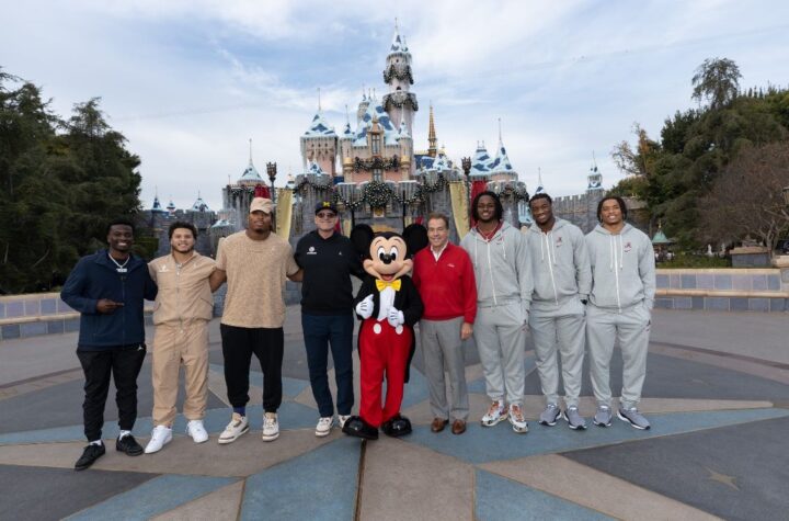 ANAHEIM, California, diciembre de 2023. Entrenadores y jugadores visitan Disneyland Park, su primera parada oficial de camino al partido de...
