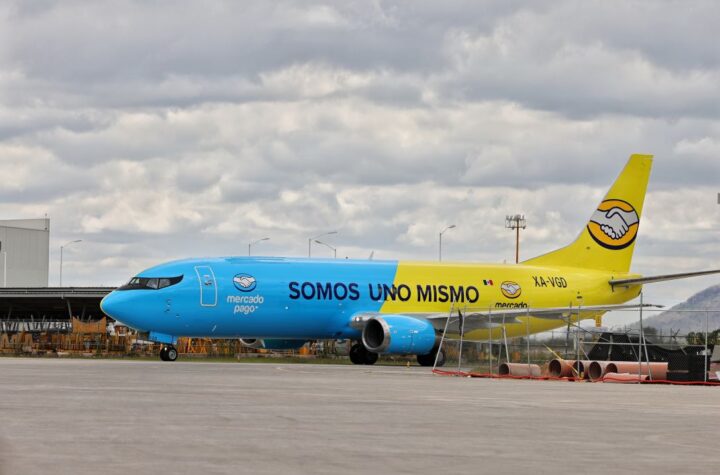 Querétaro, 23 de agosto de 2023. Como parte de una campaña publicitaria, ambas marcas presentaron un avión pintado de azul...